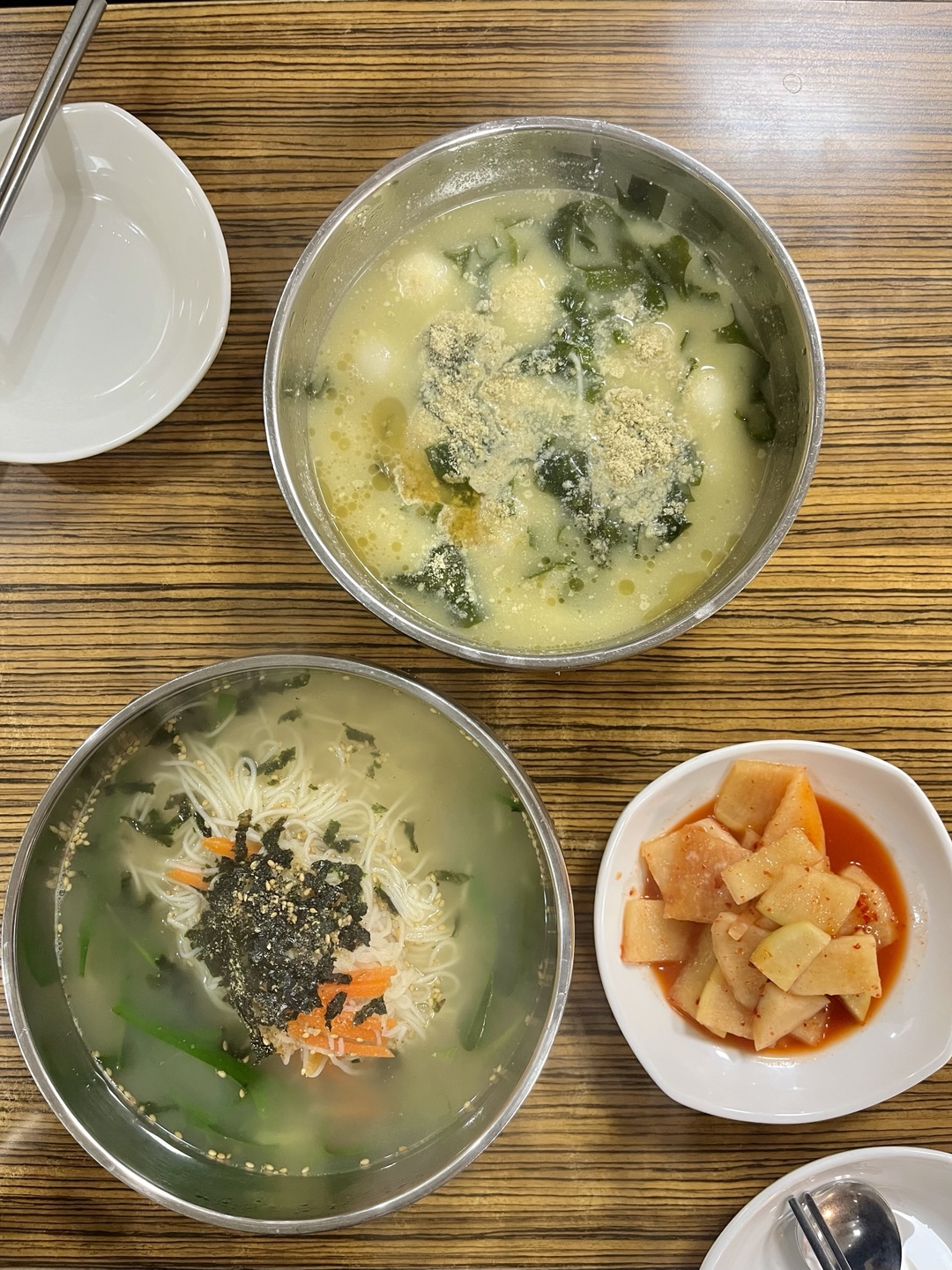 중앙시장 안쪽에 자리잡은 중앙분식! 이곳은 허영만의 백반기행에 나온 경주 맛집인데요.😋 분식집이라고 해서 떡튀순과 김밥 등을 생각했었는데 메뉴는 칼국수, 수제비, 잔치국수, 찹쌀 수제비 뿐이었어요. 찹쌀 수제비가 인기라고 하셔서 주문했는데요. 들깨 미역국에 찹쌀 새알이 동동 띄워져 있더라고요. 쫀득쫀득한 찹쌀 새알에 고소한 들깨향이 어우러져 진짜 맛있었다는.🫢 서울에서는 쉽게 먹어볼 수 있는 조합이 아니라서 더 좋았어요! 잔치국수도 깔끔한 멸치 육수에 부드러운 면발이 담겨있어서 호로록 먹었어요!