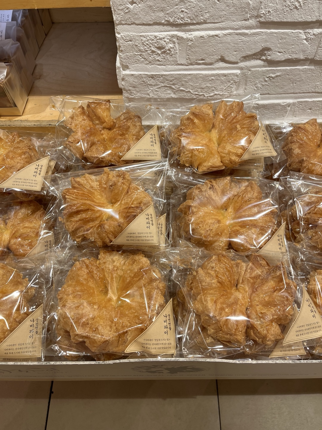 나비파이도 궁전제과의 명물이에요! 겉보기엔 누네니떼, 엄마손파이가 생각나는데요.🥧 생각보다 달지 않고 페스츄리가 입에서 살살 녹아서 맛있었어요. 우유나 커피랑 먹으면 딱! 나비파이는 전자레인지에 20~30초 돌리면 더 맛있대요!😋 그밖에도 왕사라다, 깜빠뉴, 생크림 크로와상 등이 인기니까요. 광주에 들린다면 궁전제과로 빵지순례 다녀와 보세요!